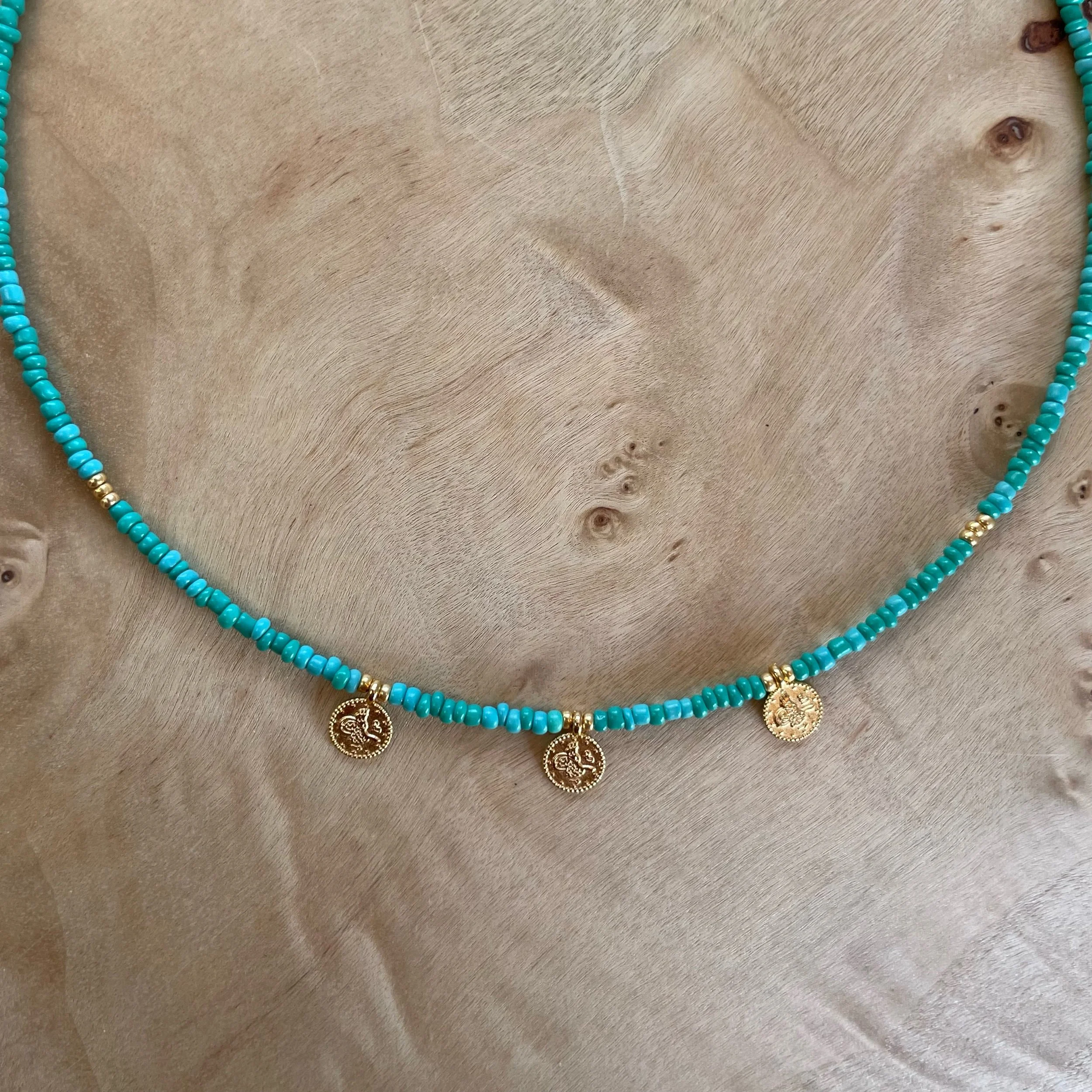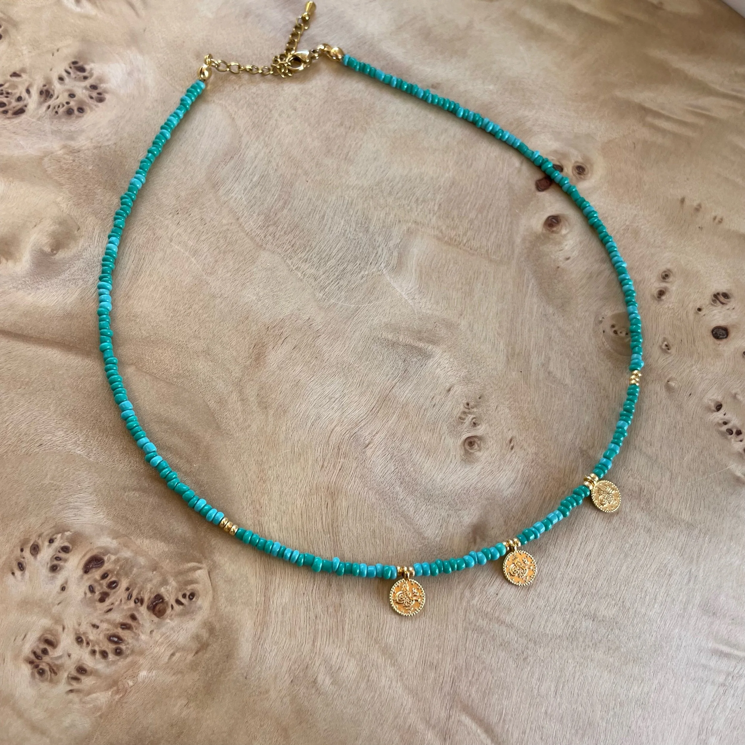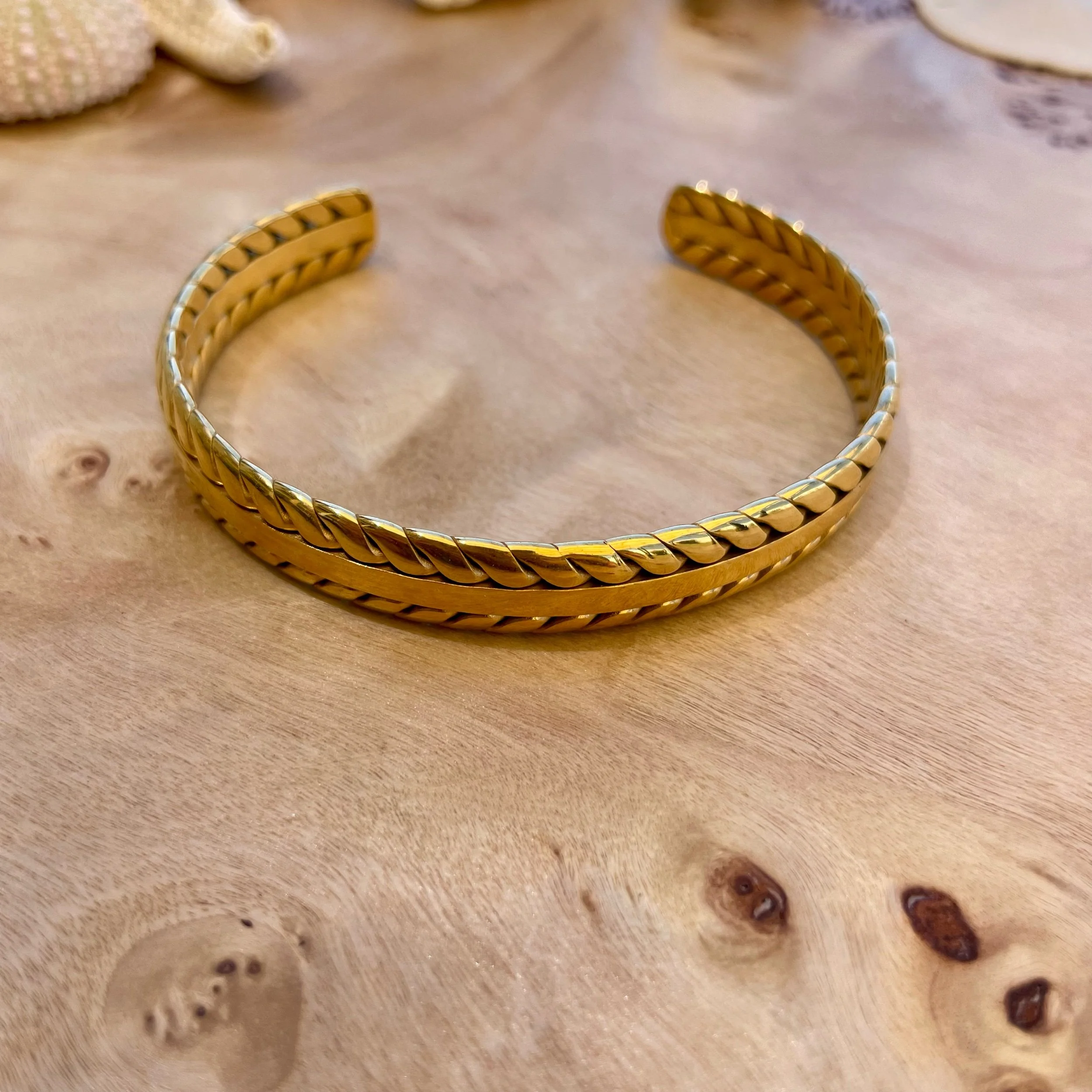 Gold jewelry necklaces, bracelets, and a pendant with a pink gemstone, placed on a wooden surface with a piece of coral.