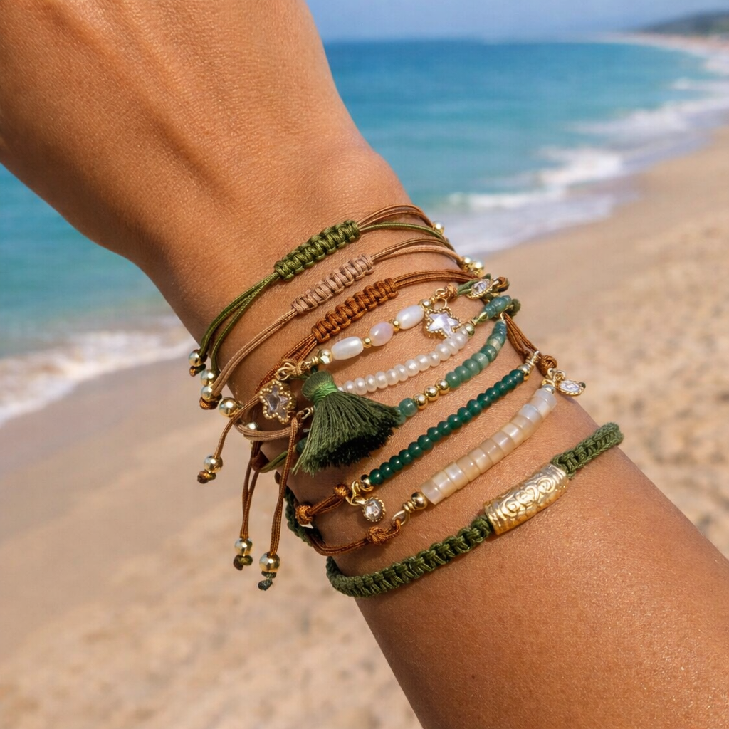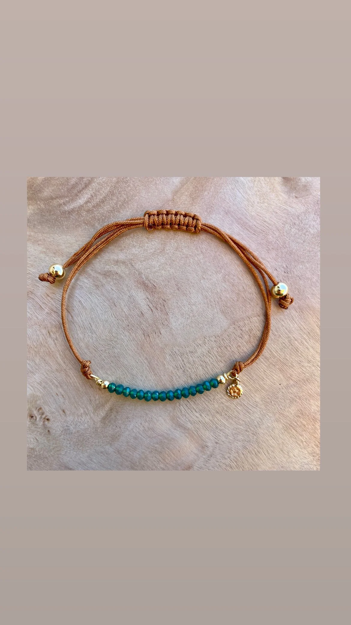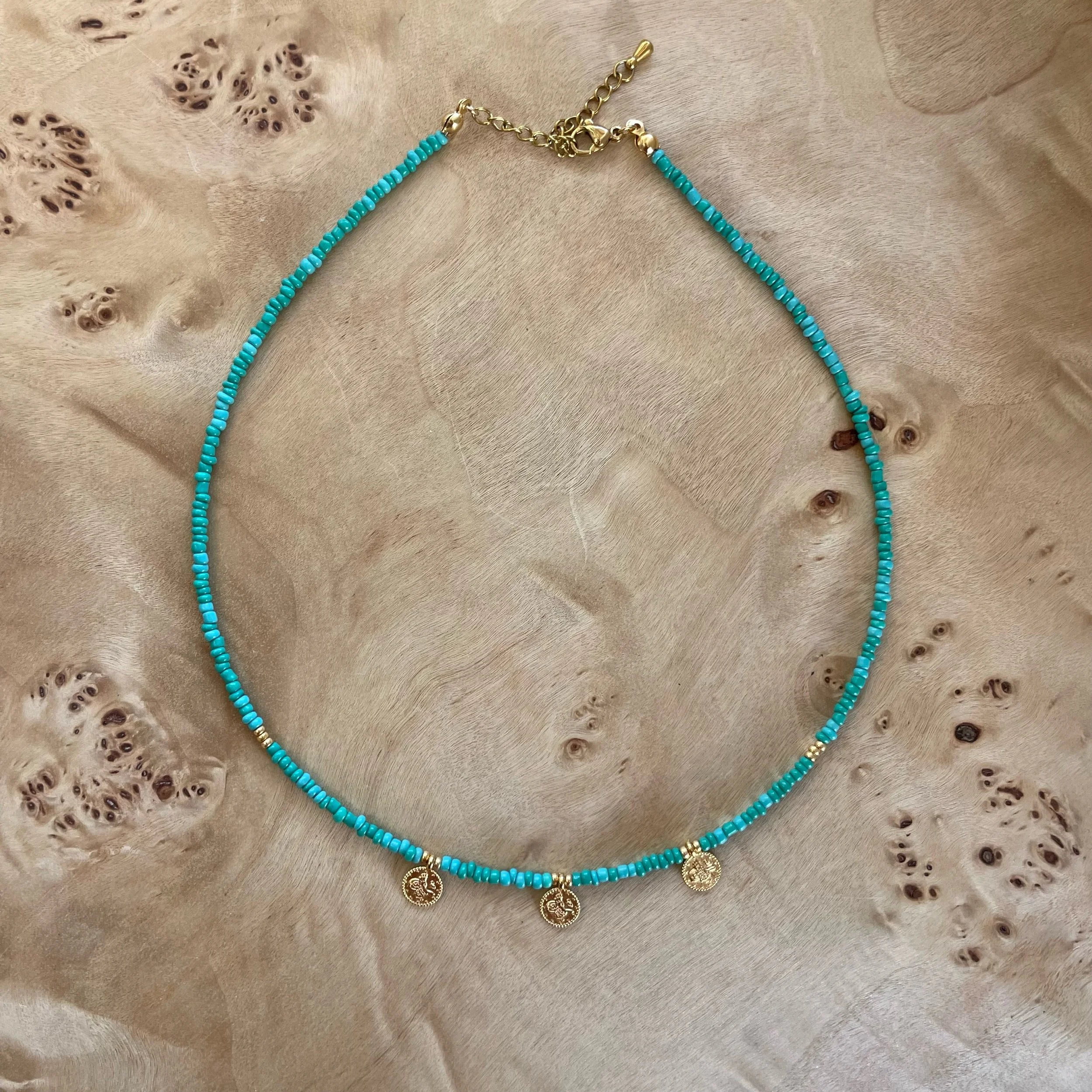 Gold jewelry necklaces, bracelets, and a pendant with a pink gemstone, placed on a wooden surface with a piece of coral.